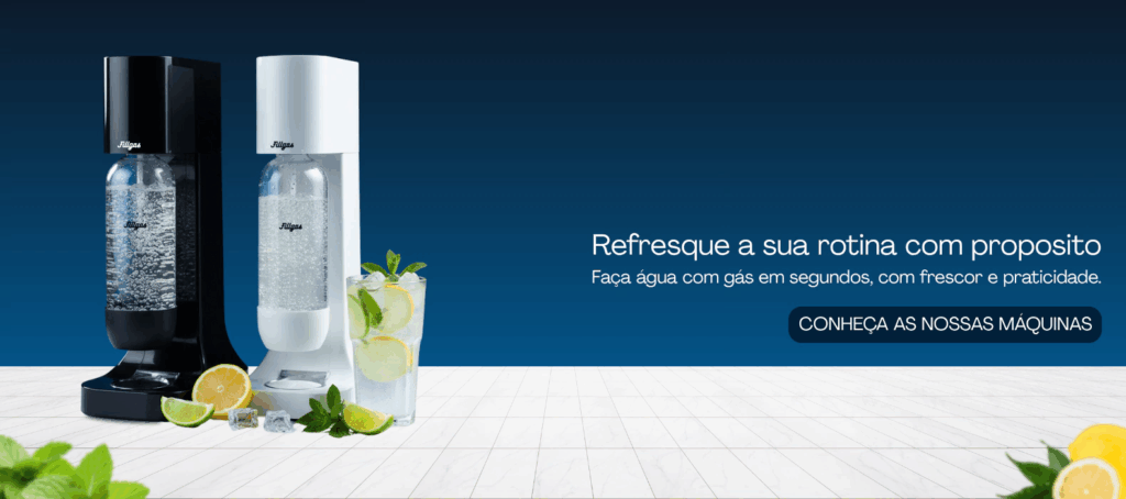 Outro ponto que transforma o dia a dia é a possibilidade de produzir água com gás em casa. Uma máquina de gaseificação elimina a necessidade de carregar garrafas do supermercado, reduzir embalagens plásticas e ter sempre água com gás fresca à disposição.